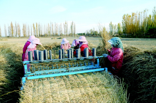 11月5日,六十九團二連承包戶冉龍安正組織職工編織草簾。用稻草制作草簾,不僅變廢為寶,每年還可為冉龍安帶來近5萬元的收入。