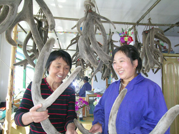 為了增加養(yǎng)殖效益,姜永貴自己學(xué)習(xí)鹿茸泡制加工技術(shù)。大慶、安達(dá)等地的養(yǎng)鹿戶(hù)很多都來(lái)加工,每年加工鹿茸上千副。姜永貴還先后與吉林長(zhǎng)白鹿業(yè)公司、內(nèi)蒙古金鹿公司簽訂供銷(xiāo)合同,掛靠公司“訂單”銷(xiāo)售,使每頭鹿平均增收近500元。與此同時(shí),姜永貴還嘗試制作鹿胎膏、鹿茸切片、鹿心血、鹿角粉等鹿產(chǎn)品,開(kāi)辟了新的產(chǎn)品門(mén)路。養(yǎng)鹿,加工、銷(xiāo)售鹿產(chǎn)品,讓姜永貴年純收入達(dá)30多萬(wàn)元。
