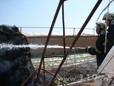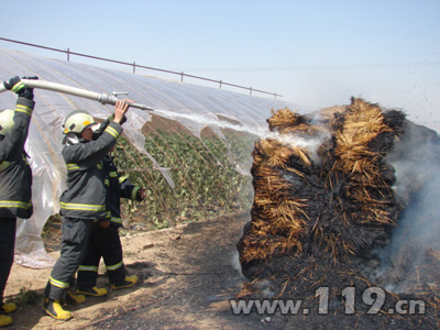 消防官兵到達(dá)現(xiàn)場(chǎng)后發(fā)現(xiàn),蔬菜大棚的一側(cè)堆放草簾子外部全部起火,蔬菜大棚的保溫膜已被炙熱的大火烤化。一股股刺鼻的味道隨風(fēng)撲來(lái)。經(jīng)現(xiàn)場(chǎng)詢(xún)問(wèn)得知,起火的草簾子是用于覆蓋大棚的?;饎?shì)借著風(fēng)力,正在迅速蔓延,如果不能及時(shí)有效控制,就會(huì)燒毀大棚內(nèi)的蔬菜,給菜農(nóng)造成很大的經(jīng)濟(jì)損失?,F(xiàn)場(chǎng)指揮員立即命令:一號(hào)車(chē)出一支水槍迅速撲滅隨風(fēng)散落周?chē)娘w火點(diǎn),阻止火勢(shì)蔓延,二號(hào)車(chē)出一支水槍從正面攻擊火勢(shì)。由于草簾堆放在一起,消防官兵一時(shí)無(wú)法將殘余火種徹底消滅。指揮員迅速組織在場(chǎng)群眾利用鐵耙等工具進(jìn)行倒垛,采取逐片消滅的戰(zhàn)術(shù)控制火情。經(jīng)過(guò)30多分鐘的奮戰(zhàn),大火終于被徹底撲滅。