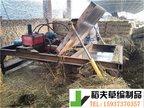 在村民李大姐家門口,映入眼簾的是兩大堆稻草和一間小木棚,木棚中放著一臺(tái)全自動(dòng)草編機(jī)。兩名中年婦女用毛巾包著頭,把稻草稈均勻放入機(jī)器傳送帶上,隨著噠噠的機(jī)器轟鳴聲,一條用尼龍線軋制好的草支墊就做好了。