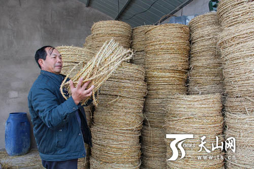 據(jù)張培亮介紹:他的家庭作坊,雇了6名工人。一季可加工草繩5000余盤,每盤送貨上門30元。一季可掙8萬多元,草繩在伊犁周邊的銷路看好。