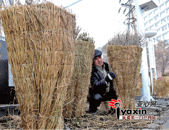 圖為園林工人吐爾洪·阿布拉正在給灌木“穿衣”。