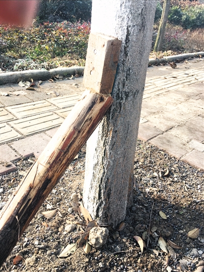 1月14日下午,記者趕往泰國工業(yè)園南環(huán)路看到,道路兩旁均種植了行道樹,正如唐先生所言,所有的行道樹上都用長約十厘米的大釘子釘了一塊方木,下面頂著一根木棍支撐。