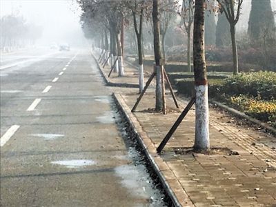 這樣做是否影響樹木自然生長?記者咨詢了市中區(qū)勝利路上的一位苗圃老板,據(jù)他介紹,冬季我市大風(fēng)天氣比較多,新移栽的喬木,必須固定樹體,既可防風(fēng)吹樹冠導(dǎo)致歪斜,同時(shí)也有固定根系的作用,利于根系生長。一般采用三腳支架、四腳支架固定法,將樹牢固支撐,確保大樹穩(wěn)固。一般一年之后大樹根系恢復(fù)好就可撤除。