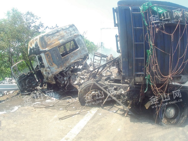 金山網(wǎng)訊 7月30日中午,揚(yáng)溧高速公路發(fā)生驚險(xiǎn)一幕,由于司機(jī)駕車時(shí)打盹,一輛半掛車行駛中突然撞上右側(cè)隔離護(hù)欄。撞破護(hù)欄后車子側(cè)翻,隨后車頭起火,引燃貨物包裝紙箱,車頭燒毀(見(jiàn)圖 仇建新 攝),連車帶貨損失巨大,萬(wàn)幸的是,車上人員無(wú)恙。