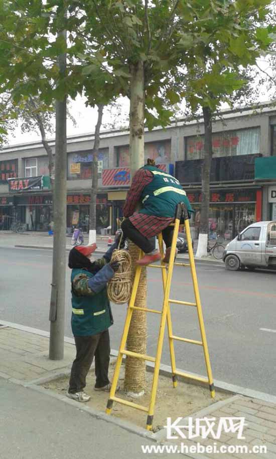 工作人員采取捆綁草繩的方式對(duì)樹(shù)木進(jìn)行防風(fēng)、防凍害處理。謝豐豐攝