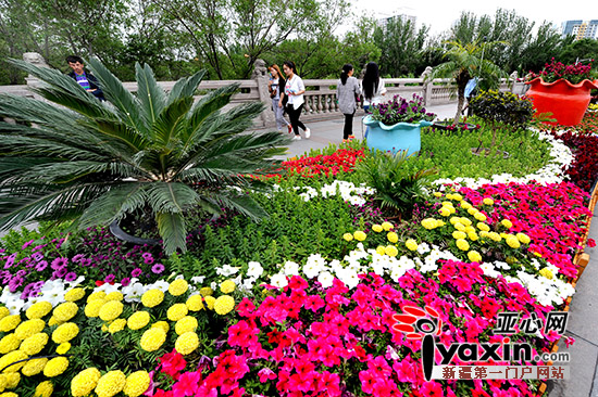 在西大橋附近,擺放著造型獨(dú)特的花堆,有梯子狀、大花苞狀,還有立體花墻,顏色各異品種多樣,給人以百花齊放之感。