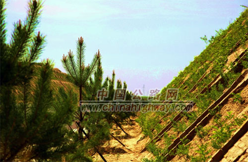 在施工過程中,榆綏管理處堅持動態(tài)設(shè)計理念,根據(jù)沙漠、河谷、丘陵溝壑等不同地貌特點,及時進行設(shè)計優(yōu)化。風(fēng)積沙地段、土石混雜地段、純黃土地段因地制宜選擇樹種綠化、美化措施,力求與自然協(xié)調(diào)統(tǒng)一。結(jié)合當(dāng)?shù)貧夂蛱攸c,在全線碎落臺、分離式路基栽植樟子松,并間隔山杏,確保營造四季常青的綠化效果。